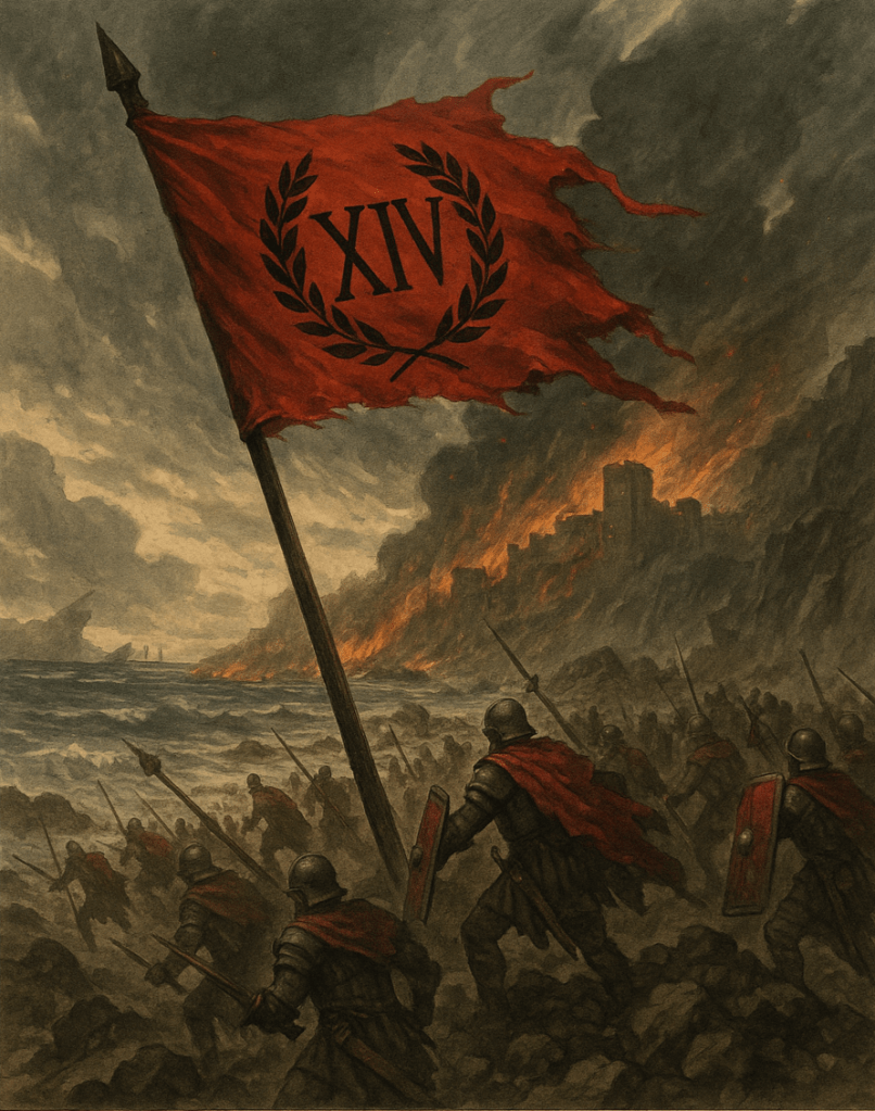 The XIV Legion moved on. Behind them, they left the symbol of new command: a black banner with a red stripe stained in ash.