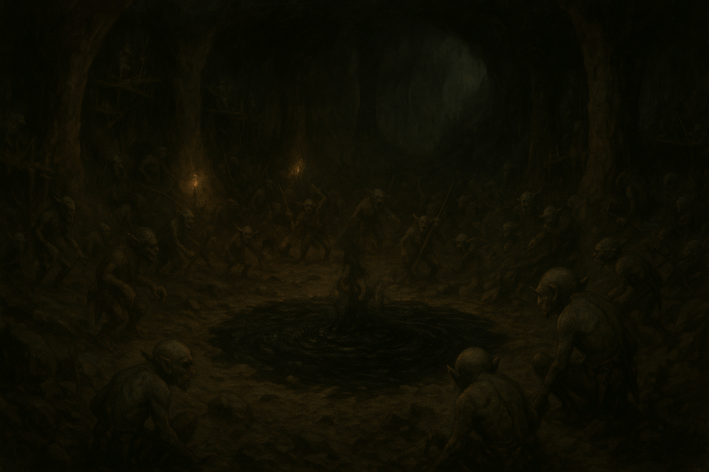 It wasn’t like any goblin warren Tharik had seen. The usual filth and chaos were here, but woven through it was a deeper madness. Goblins hunched in corners, mumbling to themselves. Others clawed at the walls until their nails split and bled, leaving streaks of dark red on pale stone. A group of orcs shambled through the chamber, not as guards or warriors but as if they had forgotten what either meant — their eyes glassy, their movements twitching and aimless.