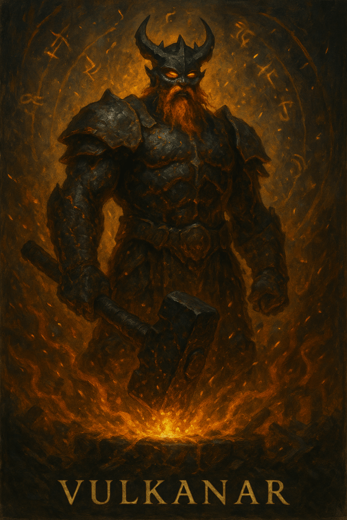 Vulkanar was born of discipline ignited by necessity — the only god forged rather than sung into being. When the First War split the divine realms and the Celestial Rift threatened to shatter creation, it was Vulkanar who answered not with words, but with fire and steel.